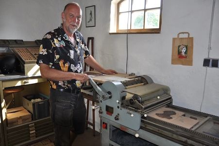 Scheune und Stall wurden 2013 renoviert und im ehemaligen Stall eine historische Druckwerkstatt mit einer Original Satzgasse und Andruckpresse Korrex Modell „Nürnberger“ (Druckformat 38x50 cm) und einem antiken Boston Tiegel eingerichtet; geeignet besonders gut für Hochdrucke aller Art (Holzschnitte, Linolschnitte, Bleisatz). Eine Kupferdruckpresse für Radierungen steht ebenfalls zur Verfügung. Diese Räumlichkeiten können auch gemietet und genutzt werden und sind ideal für Workshops und Seminare aller Art. Übernachtungsmöglichkeit auf dem Scheunenboden (Matratzenlager). Miete für Stall und Scheune nach Vereinbarung.