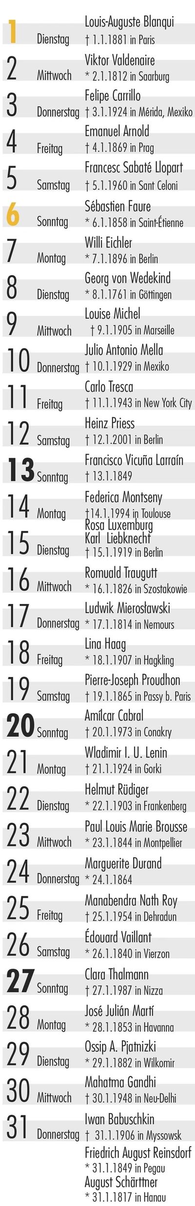 Was von der Grundidee (des Feuerwehrkalenders aus Niederalteich) geblieben ist, ist das Kalendarium (nicht mit Heiligen, sondern) mit den Geburts- und Sterbedaten von Revolutionären und Revolutionärinnen (siehe links) das rechts neben dem künstlerischen Porträt abgedruckt ist. Also 365 Revolutionären und Revolutionärinnen sind im Kalender aufgeführt. Diese Idee ist bis heute geblieben, heute sind es Musiker und Musikerinnen.